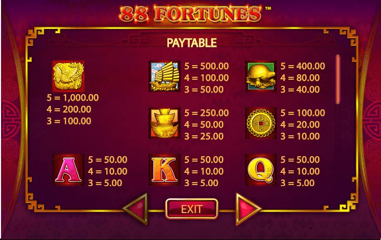 Linhas de pagamento de 88 jogos de cassino fortunas