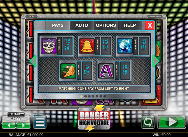 Se você estiver optando por jogar High Tonstage por dinheiro real, deve ter em mente que precisa fazer depósito de dinheiro válido para apostar e se inscrever com seus dados pessoais. Sinta -se à vontade para usar os botões da jogabilidade: PTtoPlay e Spin. O botão PTtoPlay permite que você execute as bobinas por até 100 vezes. No entanto, o intervalo de apostas é de £ 0,20 a £ 40,00 por spin. Observe que o RTP de alta tensão de perigo é de cerca de 95,67%.