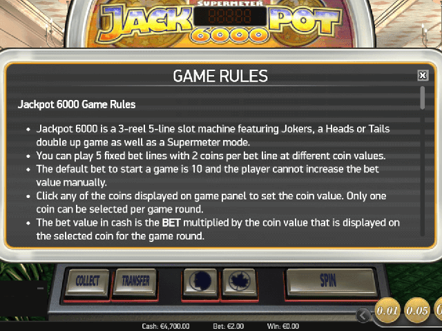 Este título de jogo gratuito de 3 linhas, 3 e 5 e 5 payline tem o tema clássico ou tradicional das frutas, com a maioria dos símbolos sendo os frutos. Este slot de estilo retrô oferece limites de apostas de um mínimo de € 0,10 a um máximo de € 10,00 por spin. O jackpot 6000 slot online Vem sem um ícone de dispersão e os recursos oferecidos incluem jackpot, opção de aposta e modo de super -medidor.