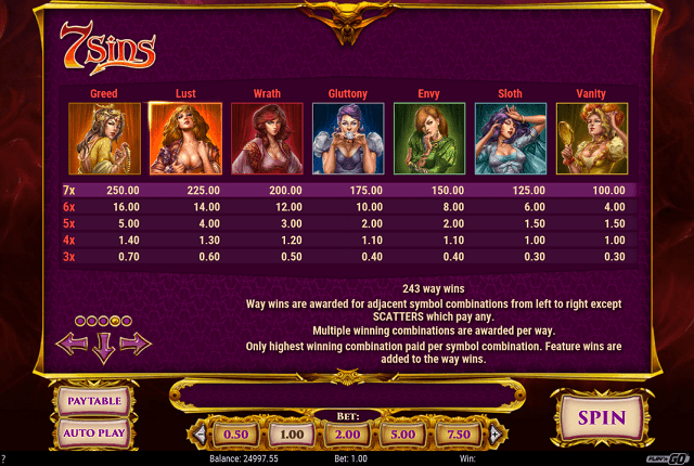 O tema do slot é explicativo por si só. O jogo será baseado em sete mulheres que abrangem todos os pecados mais mortais de desejar a variação. Há gula, o pecado do desejo, orgulho, o pecado da arrogância, luxúria, pecado da sedução, preguiça, o pecado do desmotivado, ira, o pecado da raiva, inveja, o pecado do ciúme e, finalmente, lá, ali é ganância, o pecado do ganho do material. Todas essas meninas se projetam em torno dos sete pecados capitais, mostrando lados diferentes do coração humano. A configuração de fundo e a aura roxa defumada mostram um mundo tentador cheio de travessuras. A travessura que você pode fazer enquanto joga.