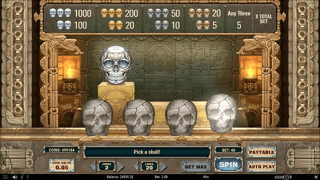 O jogo de bônus do templo asteca é lançado quando você pousa com sucesso três símbolos de crânio ornamentados aleatoriamente em qualquer lugar nos rolos. Quando a misteriosa exploração do templo começa, você pode selecionar três dos crânios cobertos de lama rolando sobre o chão do templo. Ore para que os crânios sejam valiosos e feitos de bronze, prata, ouro e diamante! O valor total do prêmio de bônus será baseado no número de crânios, escolhidos por você, que são feitos de material idêntico.
