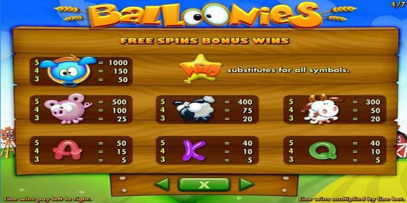 Durante os Balloonies Farm Free Spins, os jogadores recebem os mesmos valores vencedores que o jogo base. No entanto, o balão vermelho é removido da linha de símbolos. Portanto, rotações livres não podem ser recuperadas.