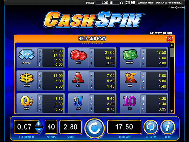 Agora veremos como operar os vários botões no Cash Spin e como navegar pelo jogo. Também examinaremos os jogos PayTable e Bonus em detalhes.