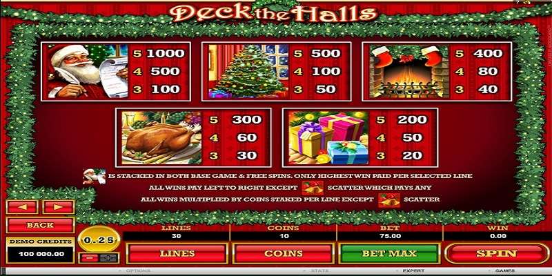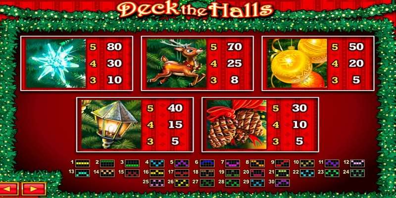 Os jogadores devem estar cientes dos símbolos importantes e do que concedem sempre que estão tentando um novo título. Esta é a razão pela qual muitos dos cassinos online que aceitam a Portugal oferecem o modo de "jogo gratuito". O símbolo mais bem remunerado é o logotipo Deck the Halls e oferece um pagamento de 4000 pela participação máxima. O segundo ícone de alto pagamento aqui é a dispersão. Terra 5 deles nos rolos para ganhar 3000 pela participação máxima. Os ícones de pagamento médio são o Papai Noel, árvore de Natal, lareira com meias vermelhas e peru. Os presentes, estrelas, renas, bolas douradas, lanternas e pinhas completam os ícones de baixo valor.