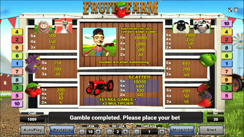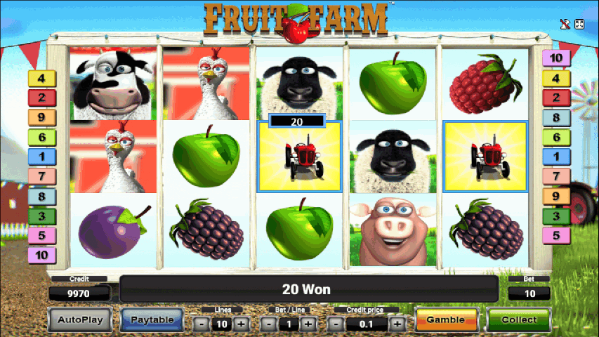 Novomatic traz à tona o FATRIMENTO FRITA como uma mudança refrescante para jogos complicados de slot em vídeo. A aparência brilhante de desenho animado deste jogo oferece um ar de simplicidade que muitos preferem. Se você está tentando tentar um jogo simplista de cassino, o Fruit Farm Free Pokie é a escolha certa. É semelhante a visitar uma fazenda de frutas com animais de celeiro e um jovem agricultor adicionando vibrações felizes de verão aos rolos.