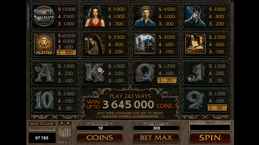 O romance imortal é o slot completo. Possui os gráficos, a jogabilidade e os recursos de bônus para dar a qualquer slot uma corrida pelo seu dinheiro. Há uma razão pela qual ele permanece um favorita dos fãs desde o seu lançamento, e parece que permanecerá assim por algum tempo.