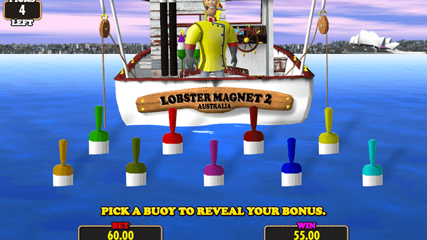 Então, quando você obtém esses três cartões, a tela muda e você é levado a outra tela em que será solicitado a selecionar uma bóia de inúmeras bóias. Todas as bóias estão carregadas de rotações gratuitas ou grandes prêmios, sendo o mais alto um multiplicador de quatro mil da sua aposta total.