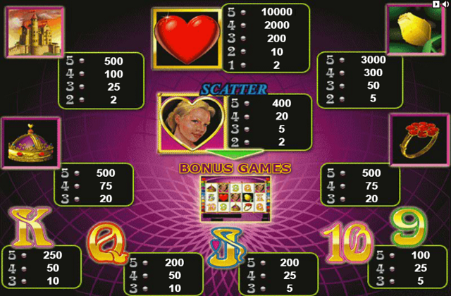 | Os símbolos mais bem remunerados do jogo são as coisas que representam o amor em sua forma mais pura - a flor dourada prestes a florescer e o coração simples que é vermelho na íntegra. | Flor: 0,20 - 120,00