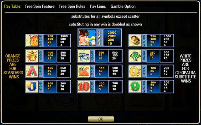 O símbolo de Cleópatra serve como a natureza do jogo. Se um ou mais desse ícone substituir outros ícones em uma vitória, seu pagamento será dobrado. O ícone pode substituir todos os outros ícones, exceto a dispersão para formar combinações vencedoras.