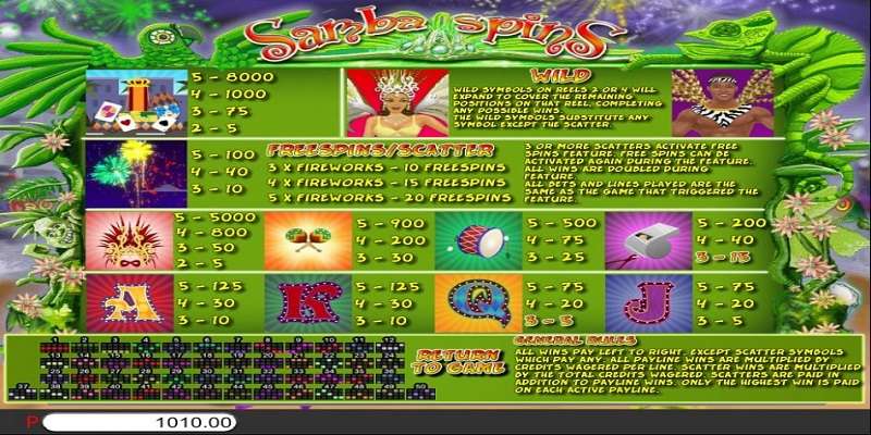 - Se você é um novato no jogo, seria sábio primeiro experimentar a demonstração de Samba Spins. Embora seja um slot bastante básico em termos de jogabilidade, familiarizar -se com seu funcionamento através do jogo gratuito do Samba Spins nunca pode doer.