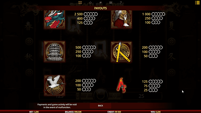 O primeiro grupo contém símbolos com temas chineses, como o templo do pagode ou o guindaste. Tais símbolos são capazes de conceder pagamentos que variam do mínimo de 25 créditos até o máximo de 2.500 créditos, que é o pagamento do Jackpot de Jackpot da Base! O segundo grupo inclui símbolos exibidos como marcas e números de cartões, e suas taxas de pagamento são modestas, atingindo um máximo de 125 créditos.