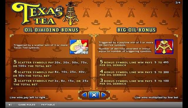 Como você encontra pelo menos três das plataformas de petróleo nos rolos, esta rodada de bônus é ativada neste jogo. Uma segunda tela ocorre onde encontra o mapa do Texas com regiões distintas marcadas. Existem contadores para cada seção. Pode -se escolher entre as diferentes seções sobre onde as plataformas de petróleo podem ser colocadas. Toda vez que se clica em uma região, a cor muda e a plataforma de petróleo aparece. As plataformas de petróleo bombeam o óleo e a quantidade de bônus aumenta no balcão. Os Derricks bombeam óleo e o bônus continua chegando até o balcão parar. O bônus total é mostrado e adicionado aos créditos do jogador. Tudo isso também pode ser apreciado no jogo de demonstração TEXAS TEA SLOT.