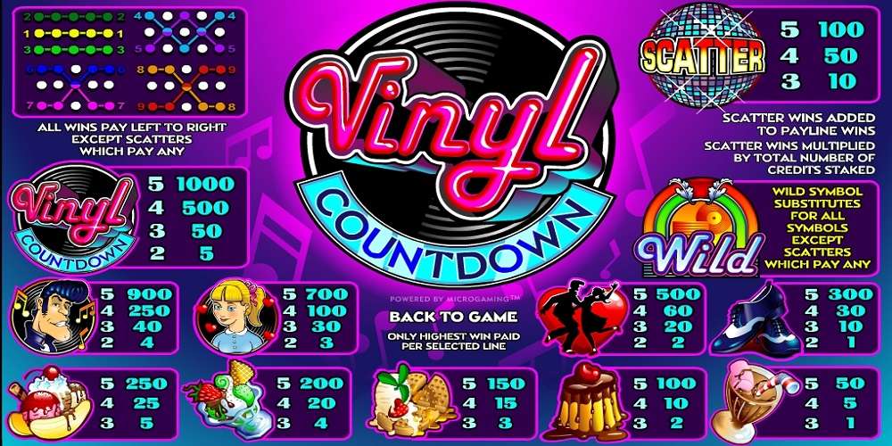 O slot de contagem regressiva de vinil está aqui para explodir sua mente, pois leva você de volta a uma experiência nostálgica da era do rock e da América dos anos 50 e 80. O slot criado por Microgaming Capta sua atenção imediatamente com seus gráficos altamente criativos e a música de fundo. Você seria capaz de ver diferentes tipos de luzes de discoteca, registros de vinil e bolas de decoração. Existem 5 rolos neste jogo e 9 linhas de pagamento no total. Existem vários símbolos especiais disponíveis neste slot que você gostaria de jogar completamente como jogador.